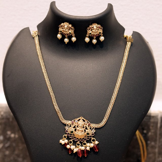 This exquisite temple jewelry set features a beautifully detailed Lakshmi pendant adorned with ruby-toned stones, pearls, and intricate gold craftsmanship. The elegant dual-chain design enhances its royal appeal, while the matching earrings complete the traditional look. Perfect for weddings, festive occasions, and cultural celebrations, adding timeless grace and heritage charm.